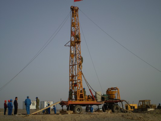 該拖車鉆機由QG20拖車、HXY-1500鉆機、鉆塔、立塔支架、落塔支架、NBB250/6泥漿泵、NY-3擰管機、液壓系統、配電柜等部分組成。