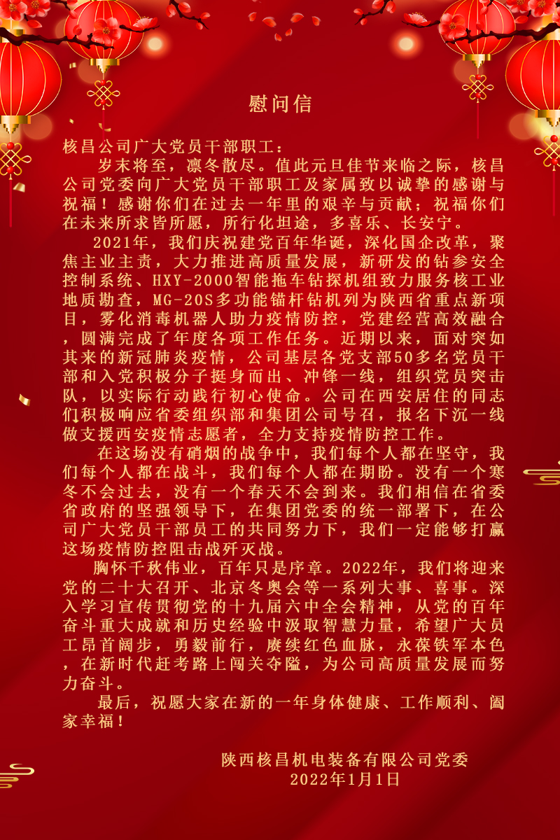在抗擊疫情這場沒有硝煙的戰場上,在疫情防控的特殊關鍵時期,核昌公司有許許多多干部職工堅守在各自工作崗位上。12月30日,公司黨委書記、董事長王超宏,副總經理、工會主席李偉代表...