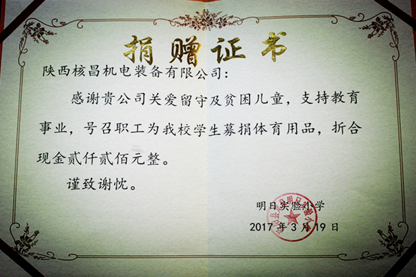 “傾心公益,傳遞愛心”,多年來,核昌公司干部職工一直熱心于公益事業,主動發揚雷鋒精神。此次,核昌公司團委通過組織職工為留守兒童募捐,希望在校學生提高鍛煉身體的意識,幫助他們健康成長。受捐學校舉行了捐贈儀式,表達了對核昌公司職工的感激之情,并為公司贈予了榮譽證書。