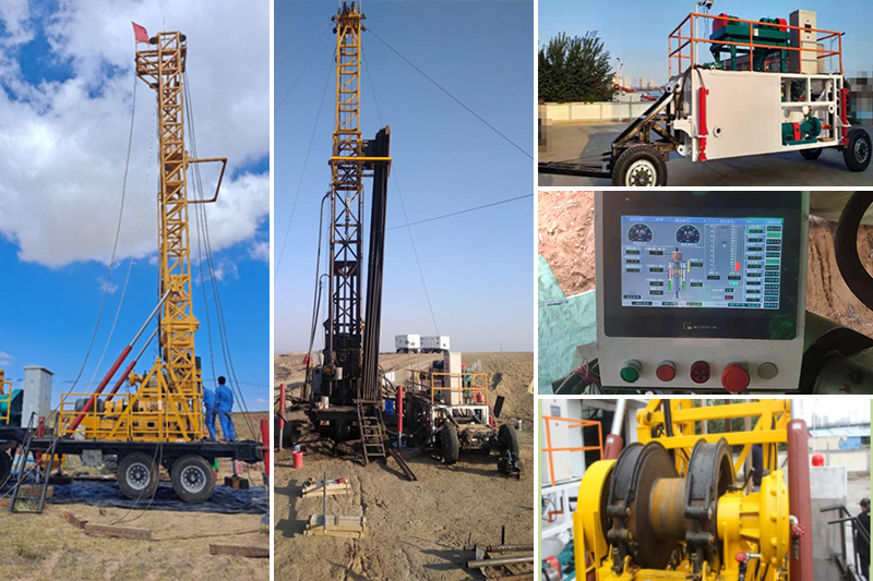 HXY-1600型(機械動力頭長行程給進)拖車鉆機和HXY-2000智能鉆探機組,是一款用于砂巖型鈾礦地質勘探和開采、機動性好、卷揚機提升力更強、鉆探深度更深的新產品。該設備與國內外同類鉆機相比,在進尺速度、上下鉆速度、孔底壓力控制、鉆進參數顯示和控制方面具有顯著的特點,杜絕了原鉆機鉆進能力不足、鉆塔承載能力小、鉆塔高度低、輔助工作時間長、卷揚機排繩困難、卷揚機操縱費力、鉆塔最大負荷無法限定等缺點,得到了中核集團208大隊、243大隊、216大隊、湖南中核勘探有限責任公司、內蒙煤田地質局等單位的一致認可。