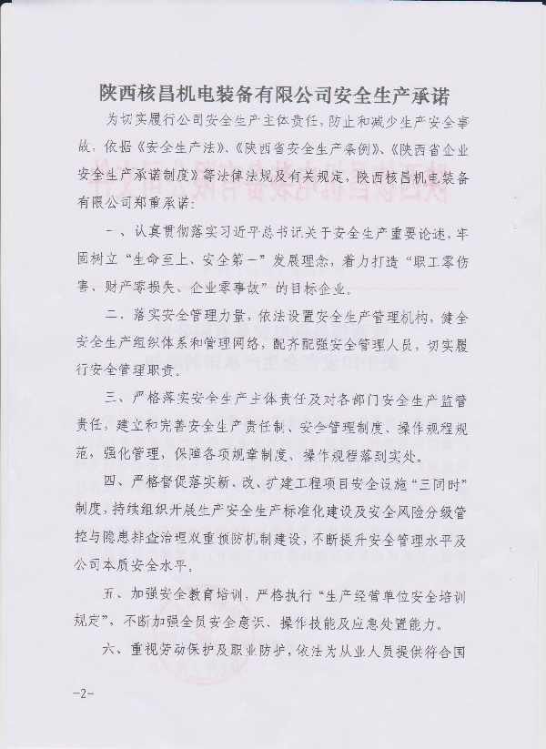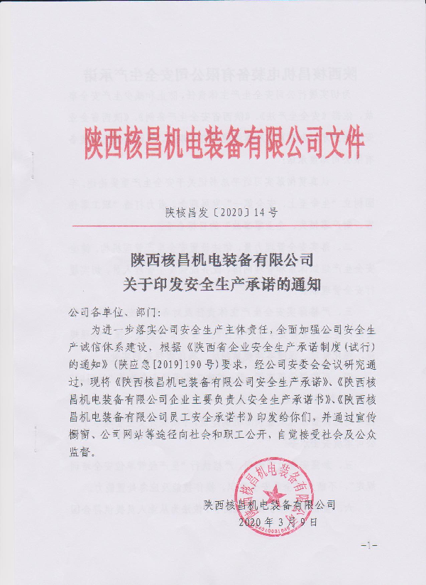 陜西核昌機(jī)電裝備有限公司關(guān)于印發(fā)安全生產(chǎn)承諾的通知